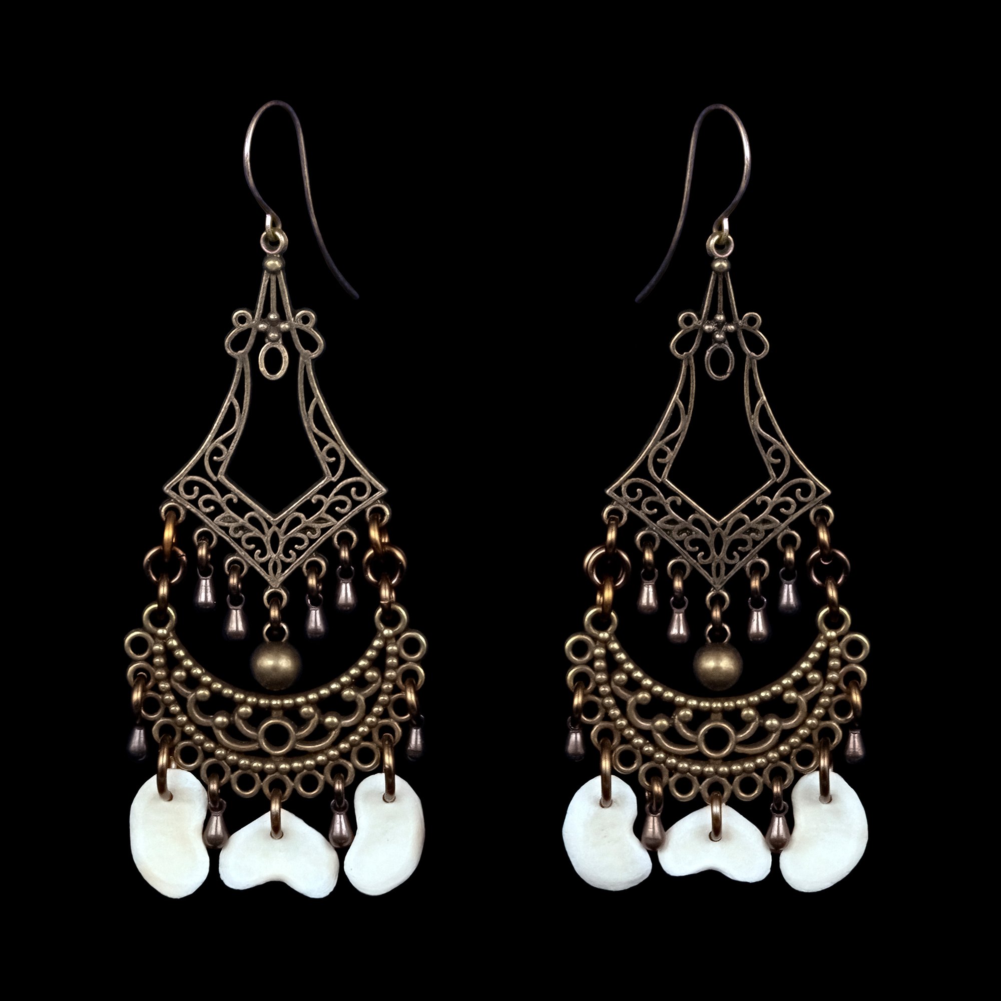 These earrings are so fabulous, and no one will even realize you're wearing bones! (A plus or a minus, depending upon your crowd.) They are made from vertebral caps from a cat, and are heavily embellished with brass stampings and antique brass drops. They feature antiqued brass shepherd's hook ear wires, and measure approximately 3.5" long by 1.25" wide.