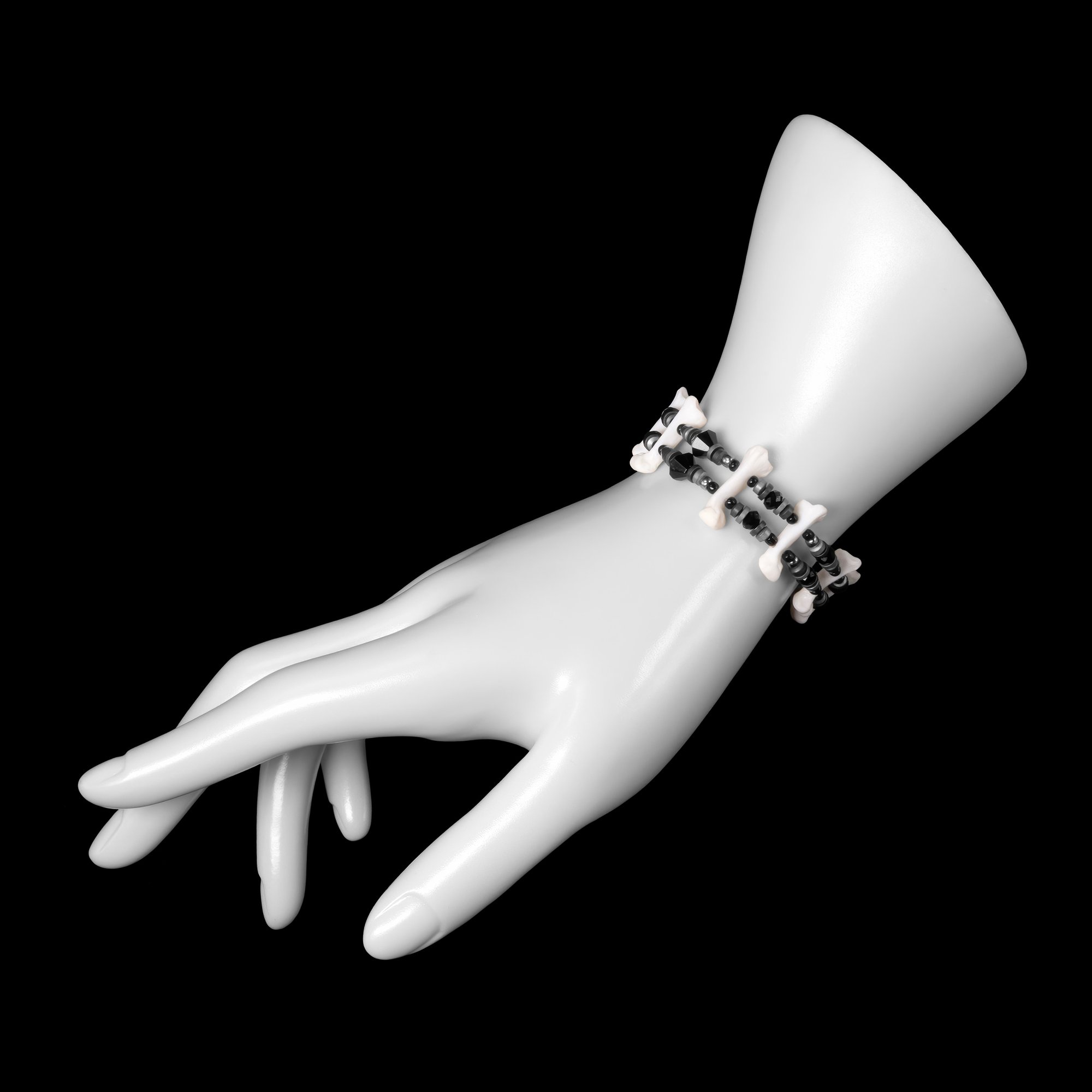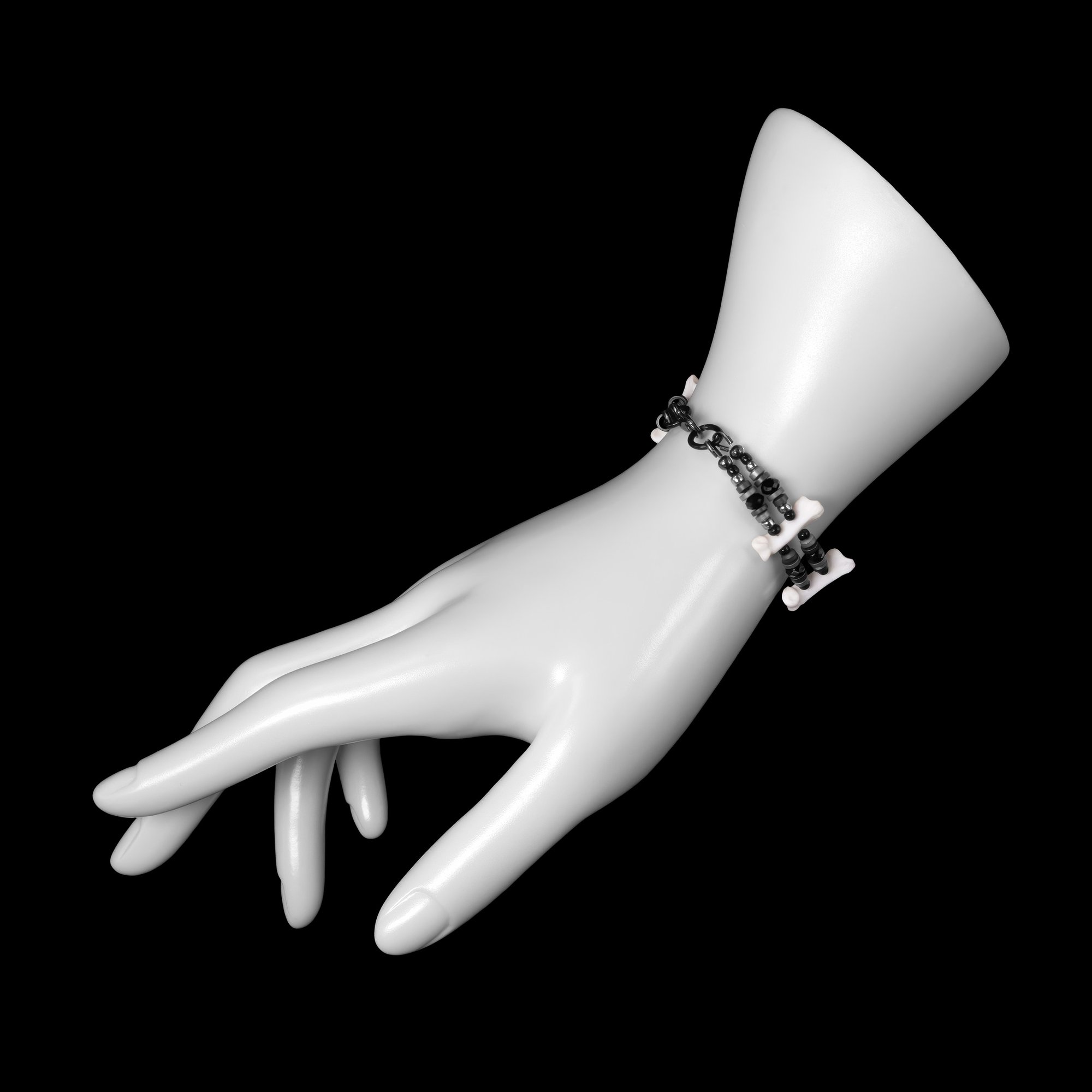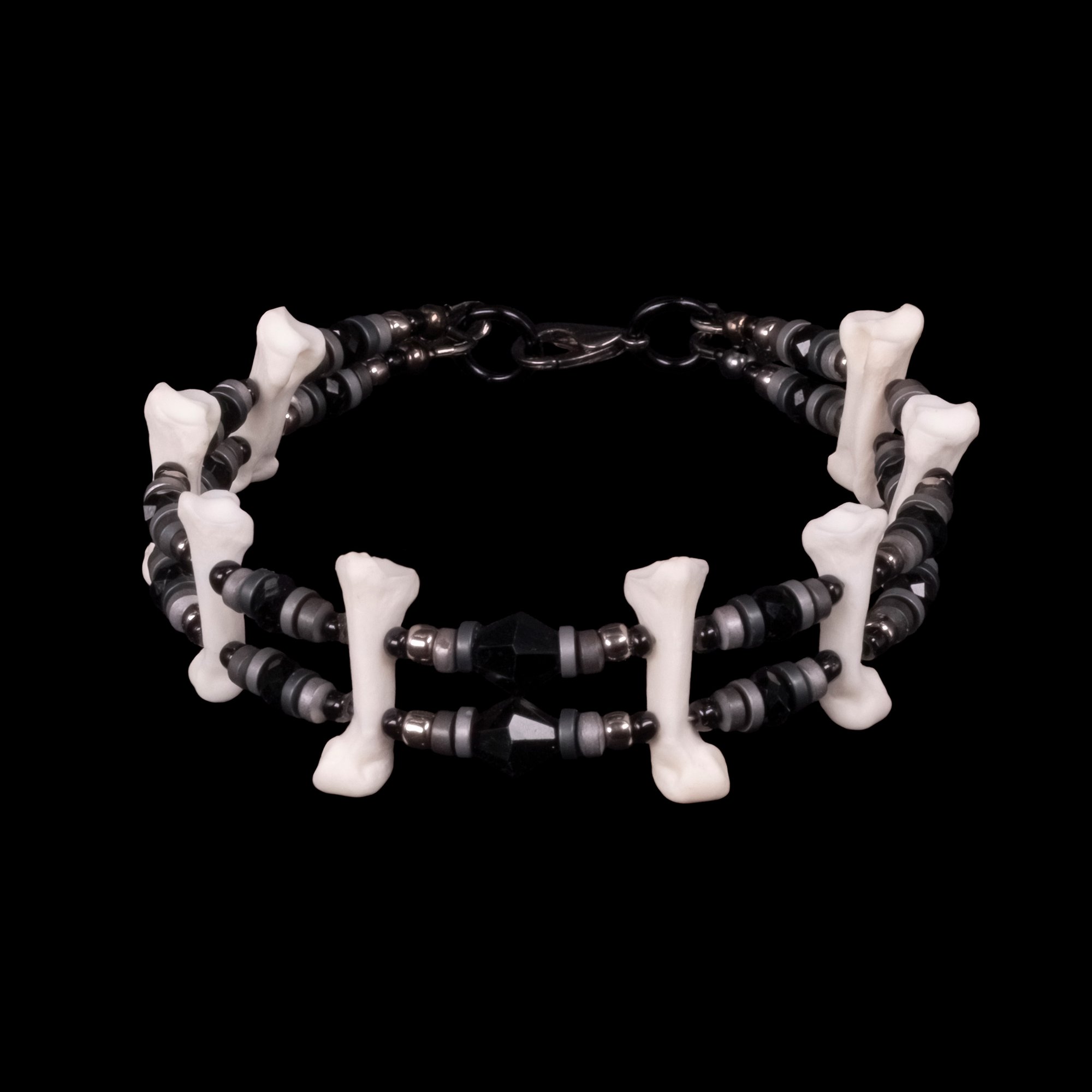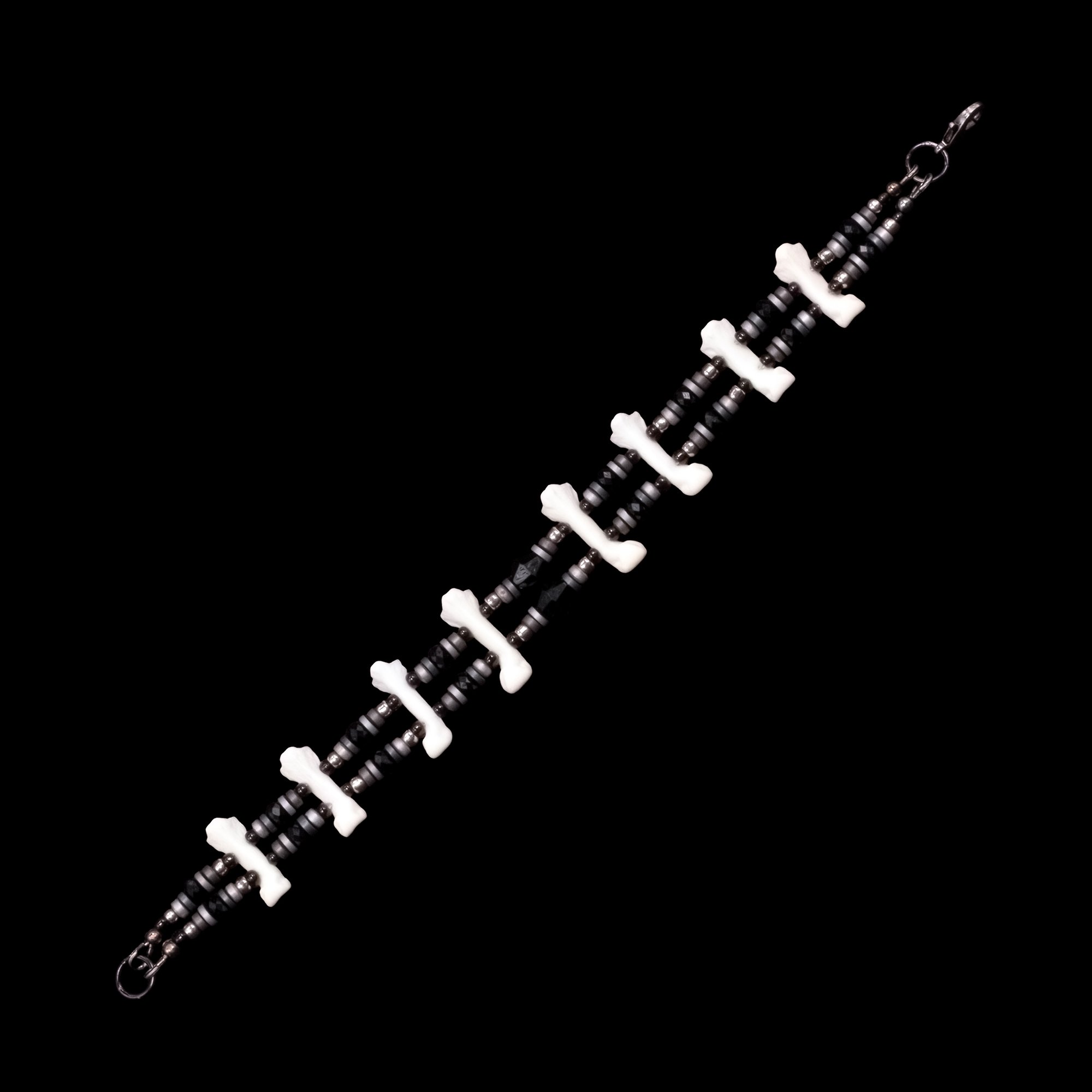 This bracelet is composed of small bobcat toe bones. It is embellished with two strands of silver, gunmetal, and black beads and features a black lobster claw clasp. It is comfortable, light, and easy to wear. The internal circumference is approximately 7.25", but I am happy to adjust the sizing for you if needed. I very rarely make any pieces with black and silver, so grab it while you can!