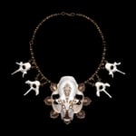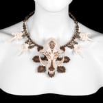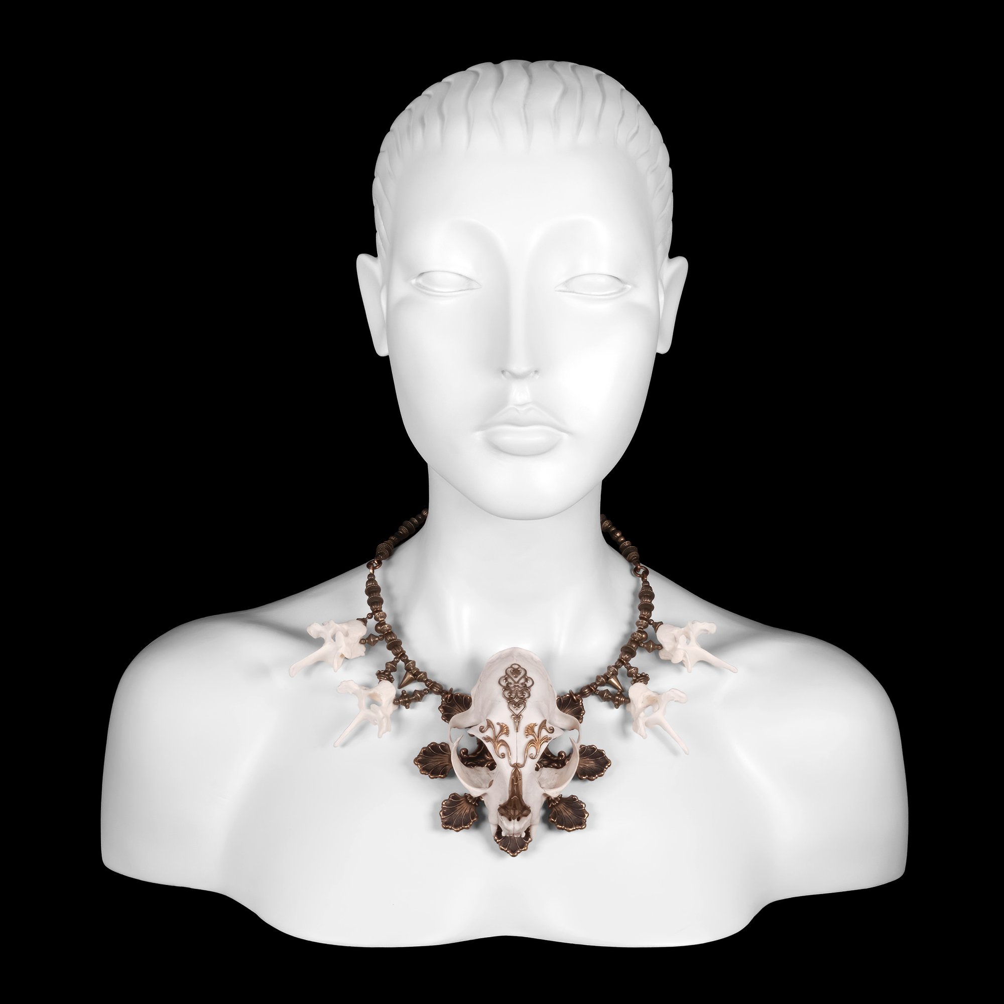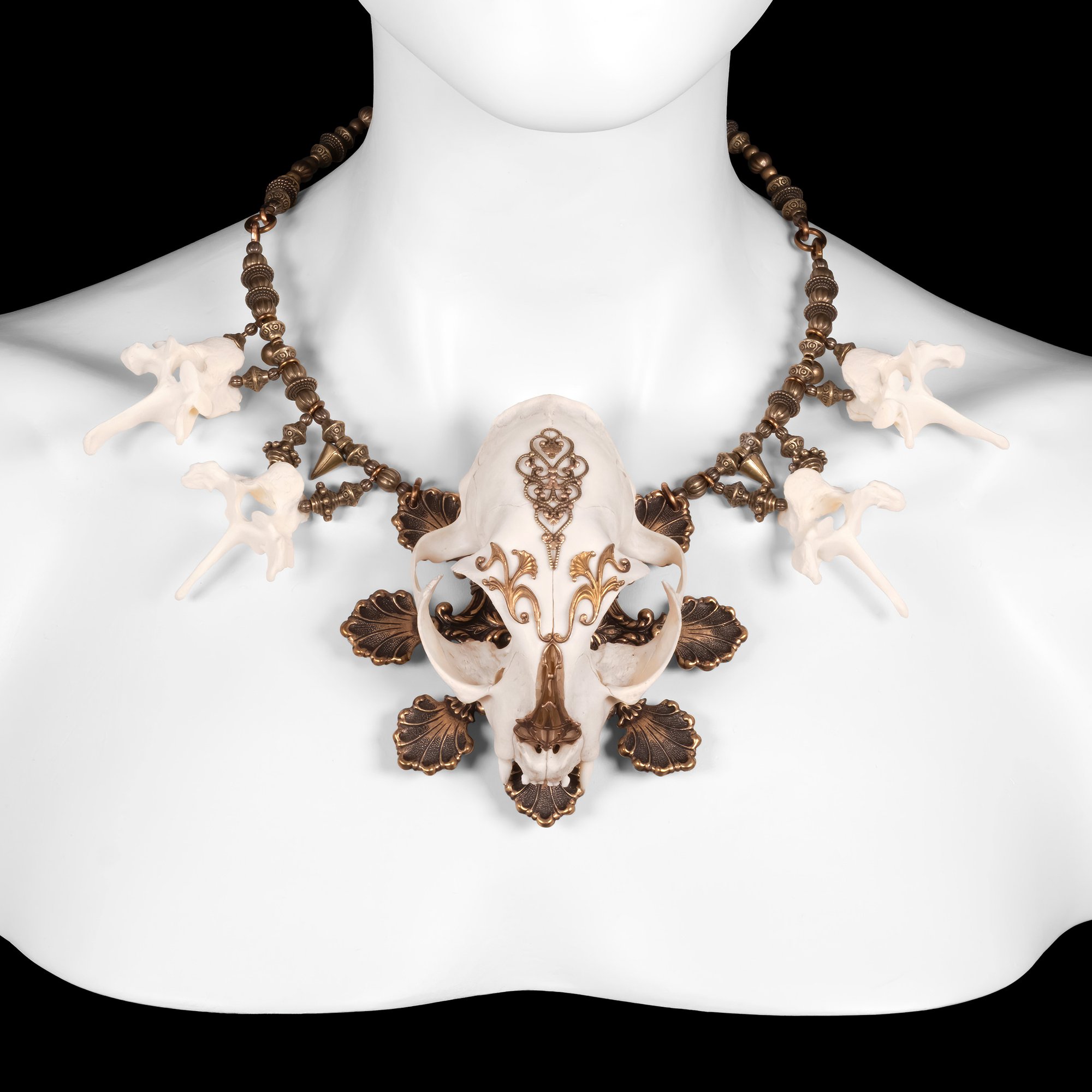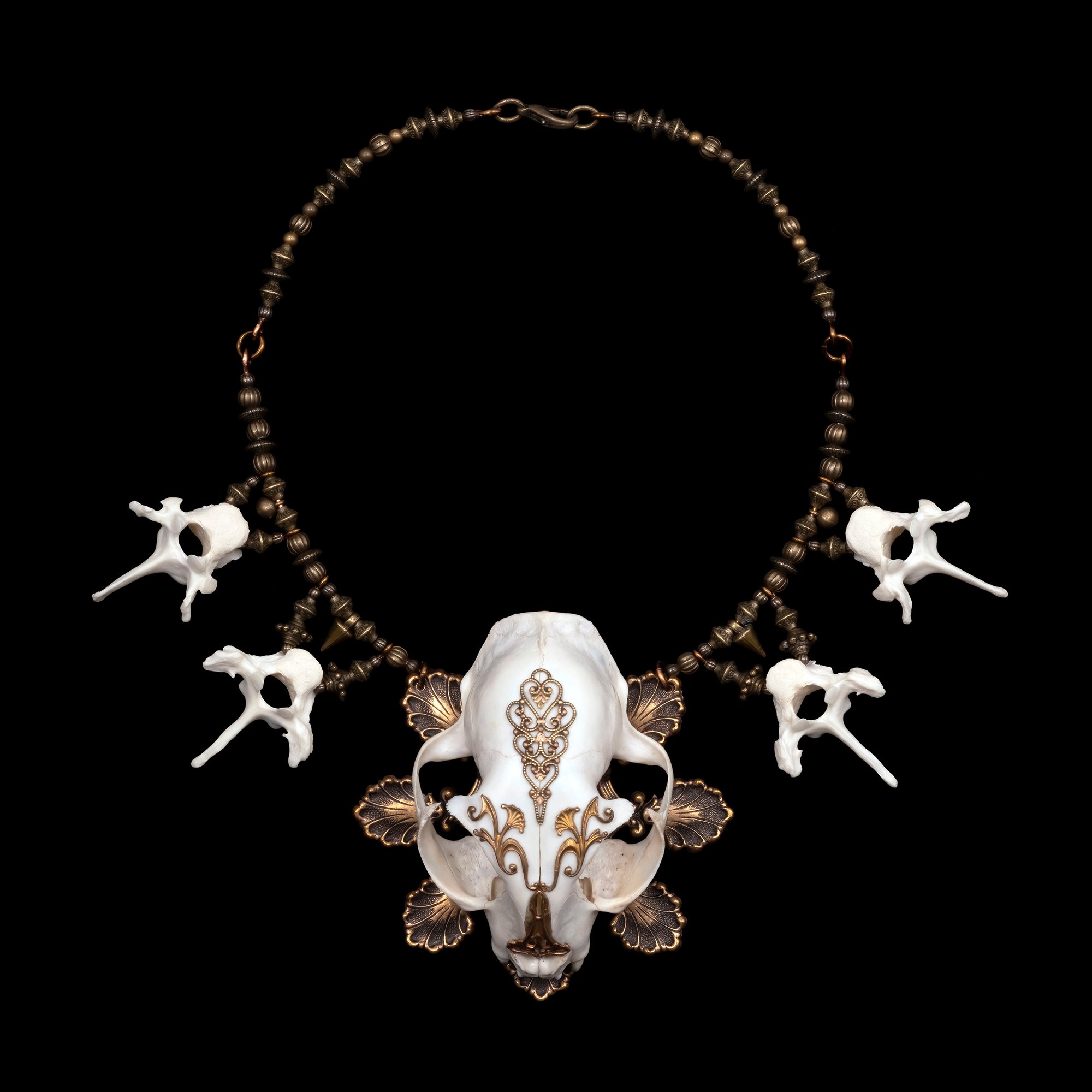 This elegant statement necklace is made from a cat skull embellished with filigree and stampings, and beaver vertebrae on each side. It features vintage brass toned beads and drops and a large, ornate floral stamping.