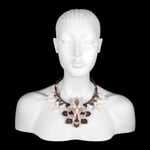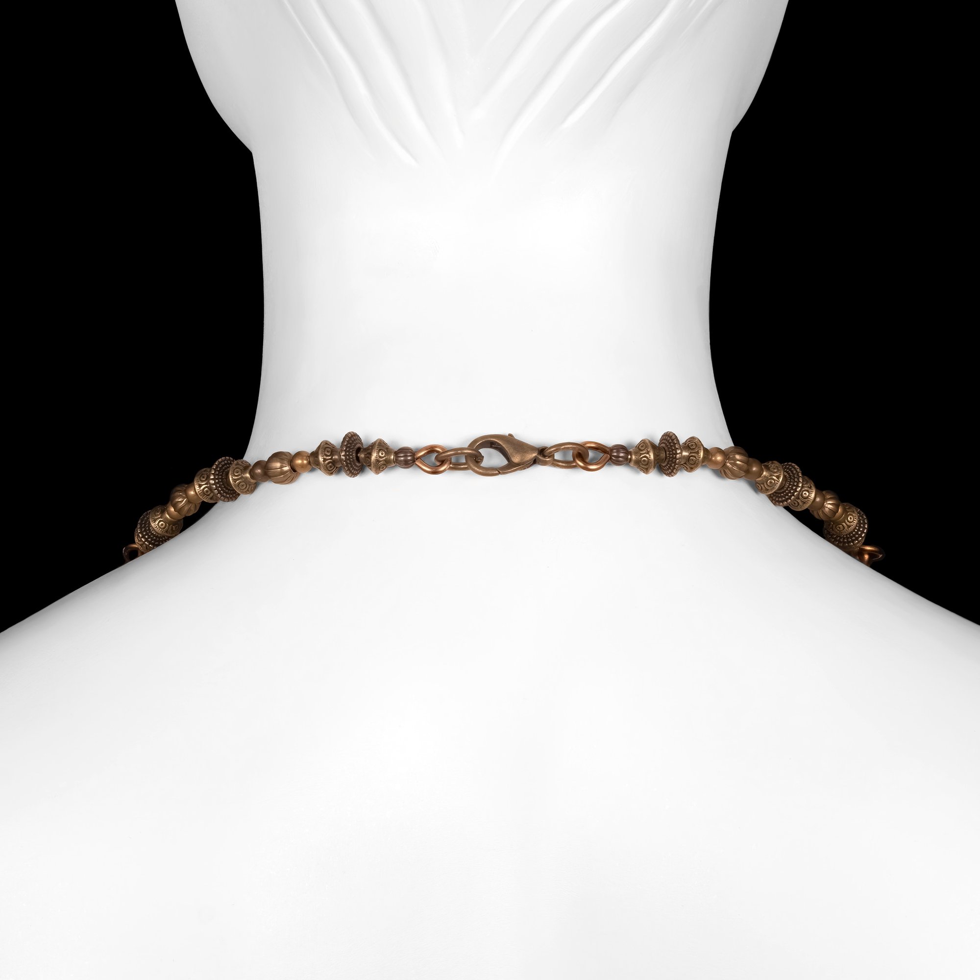 This necklace measures approximately 17" around, and 9" by 9" laid flat. It features a brass lobster claw clasp.