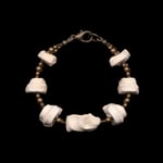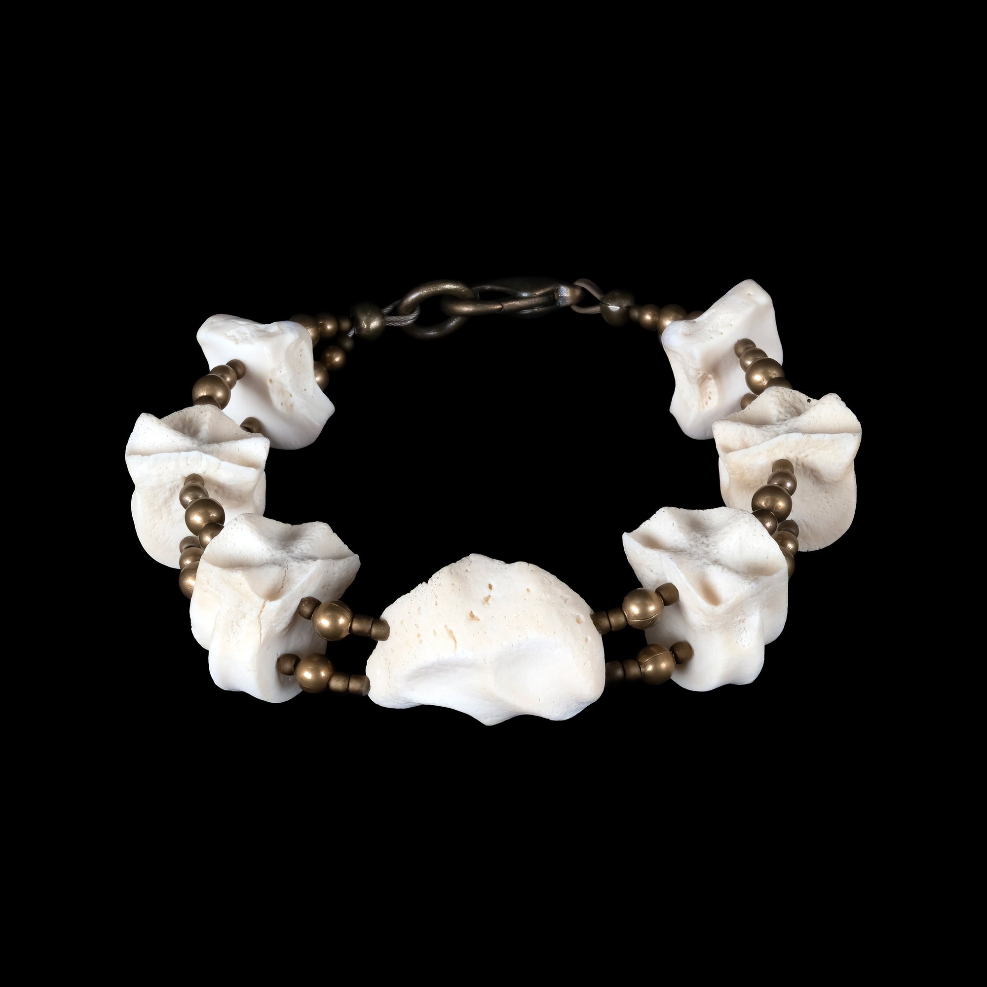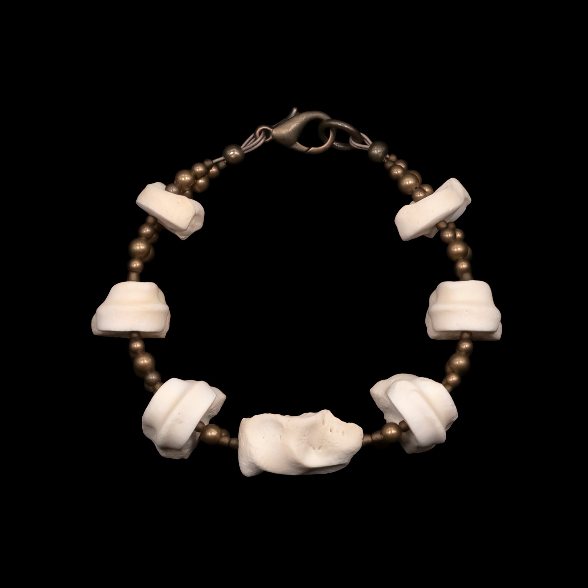 This two-strand bracelet is composed of fawn bones - primarily hoof bones. It is embellished with vintage brass beads and features a lobster claw clasp. The internal circumference is approximately 6", but I am happy to adjust the sizing for you if needed.