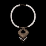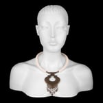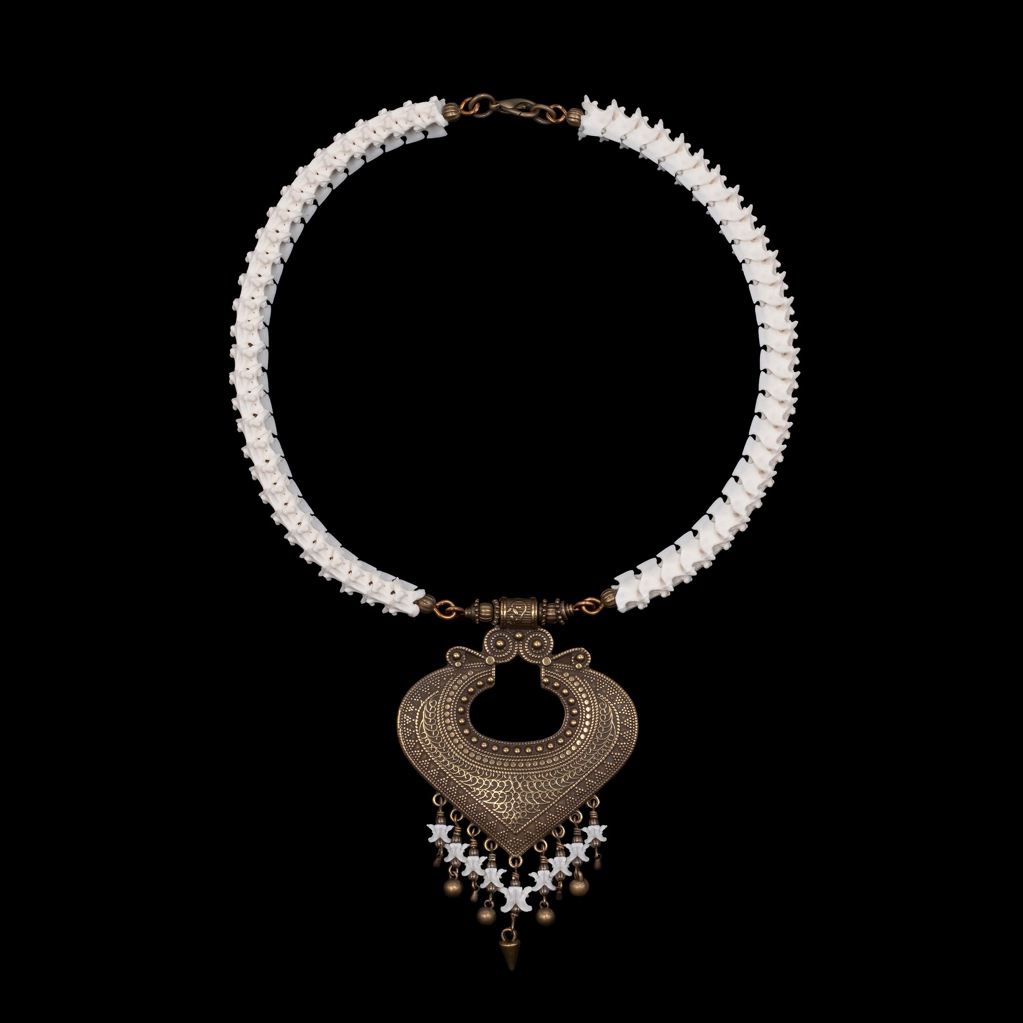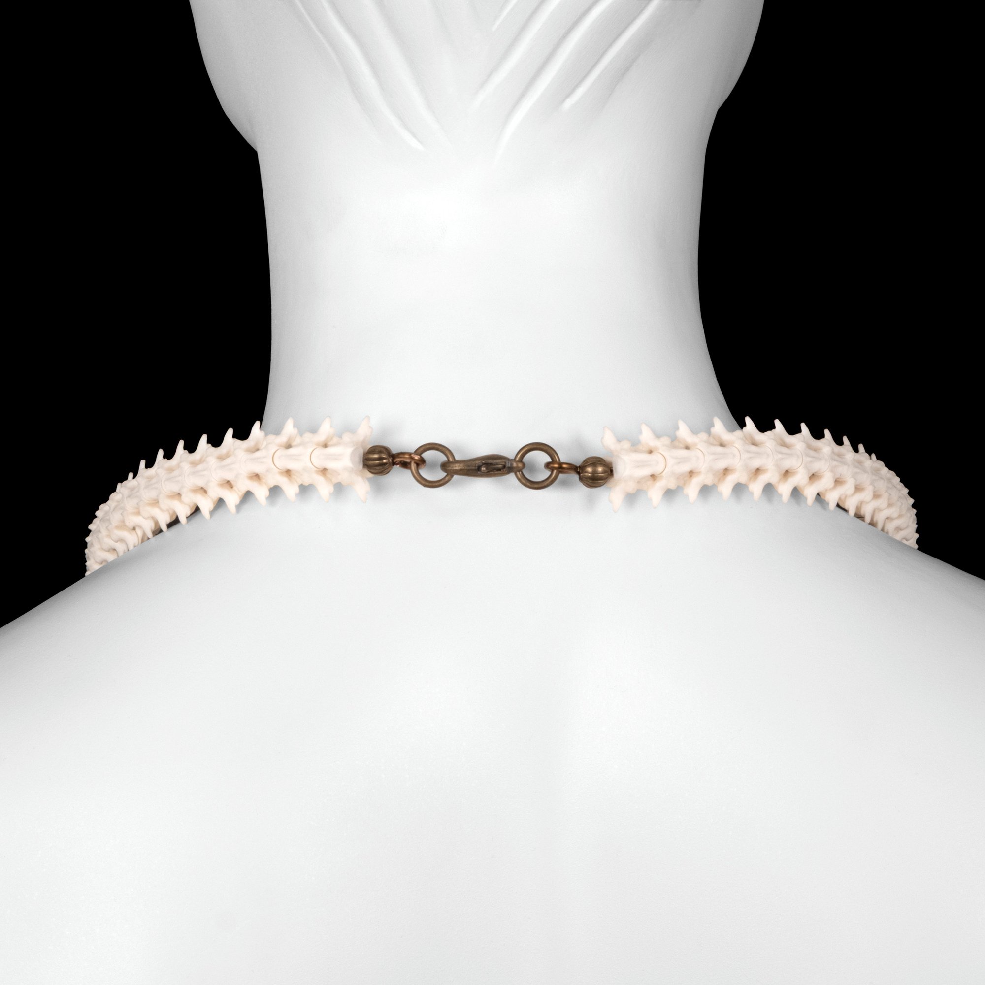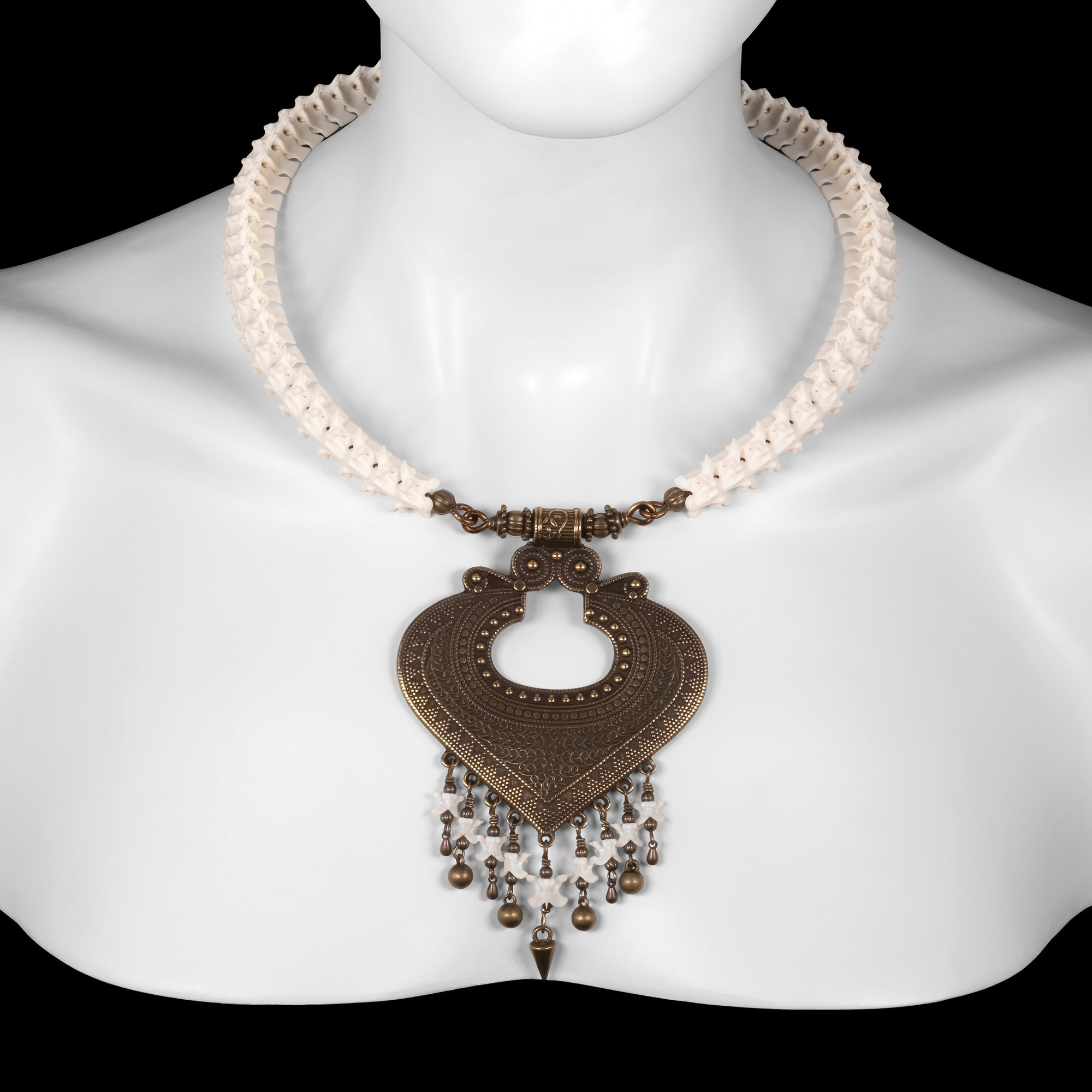 This elegant statement necklace is made from larger snake vertebrae around the neck and smaller snake vertebrae falls on the centerpiece. It features vintage brass toned beads and drops.