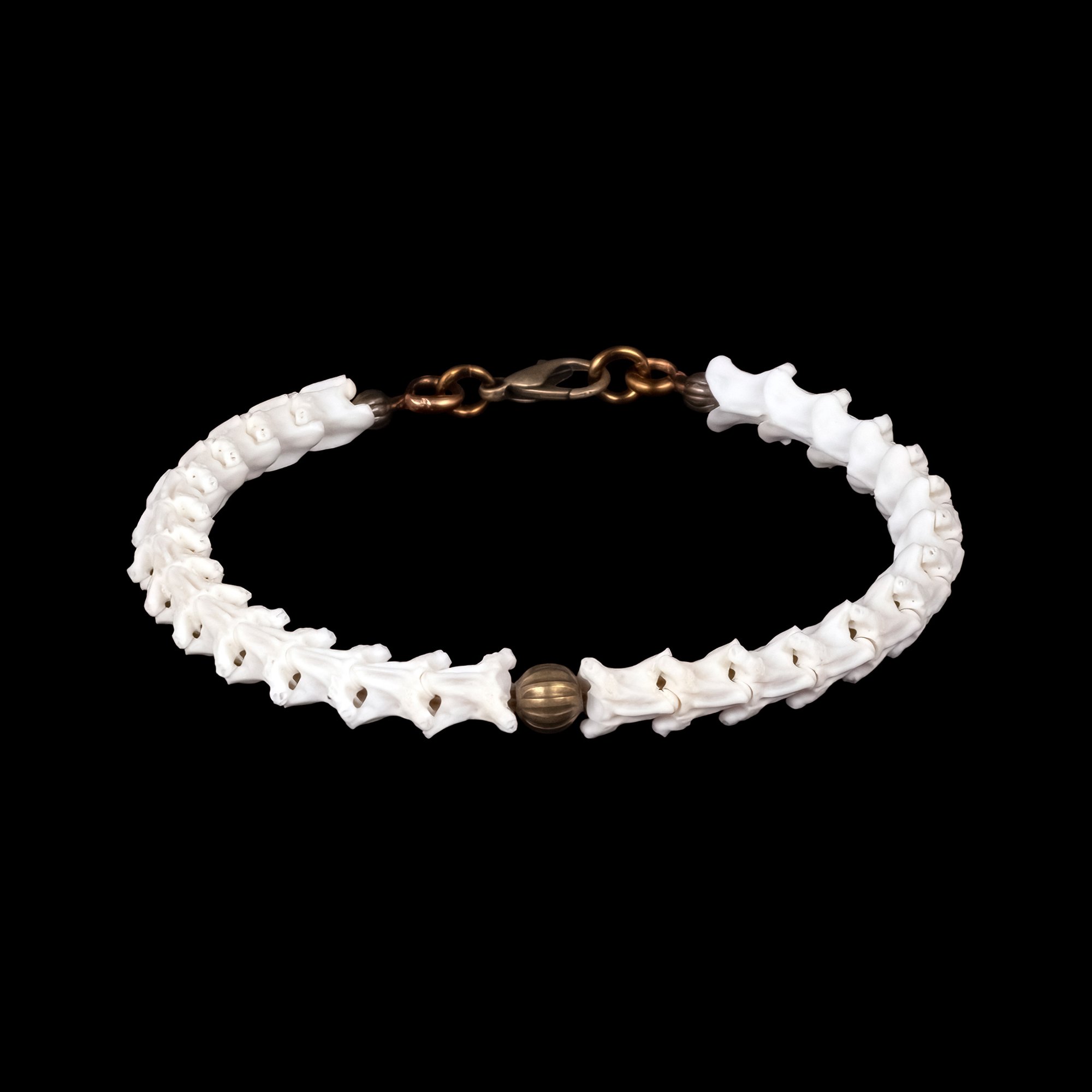 This bracelet is composed of snake vertebrae. It is a nice, understated design that pairs well with all of my snake vertebrae necklaces. The sharper points on the vertebrae have been sanded down so that it is more comfortable to wear. It is embellished with vintage brass beads and features a brass lobster claw clasp. The internal circumference is approximately 7".