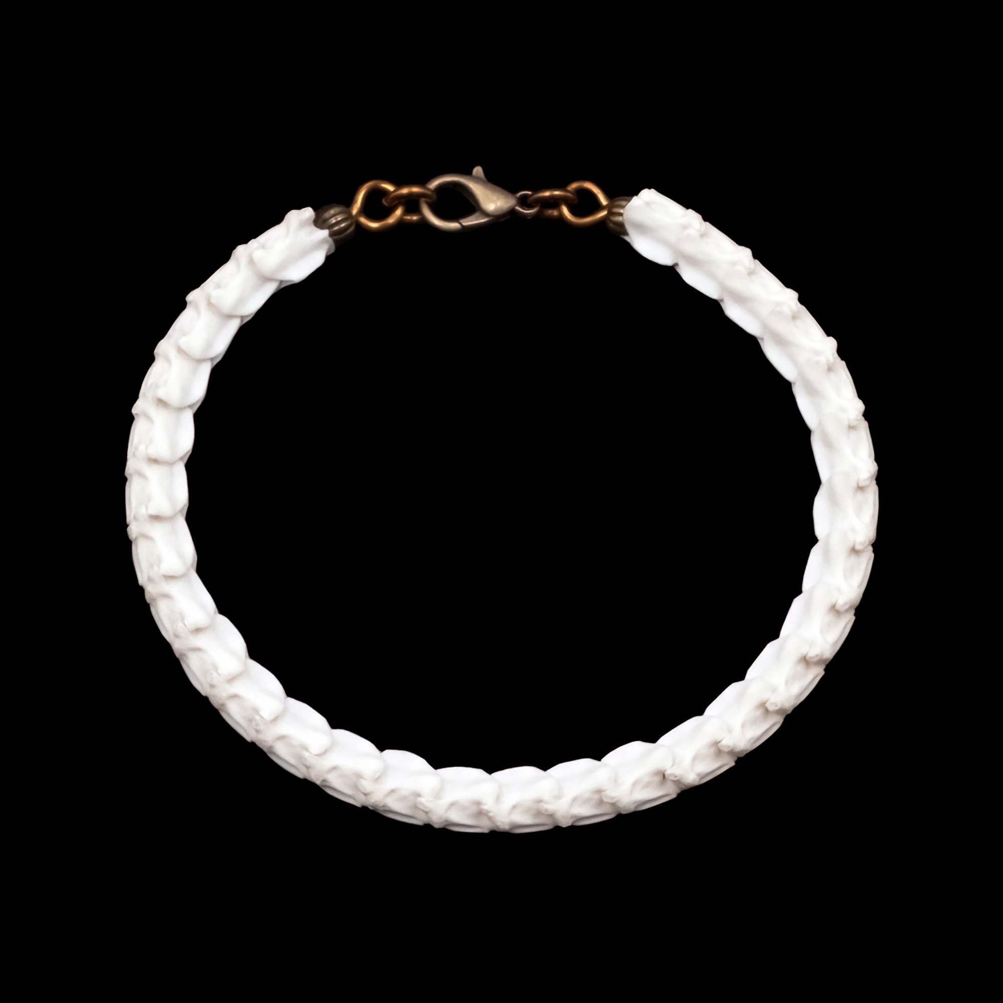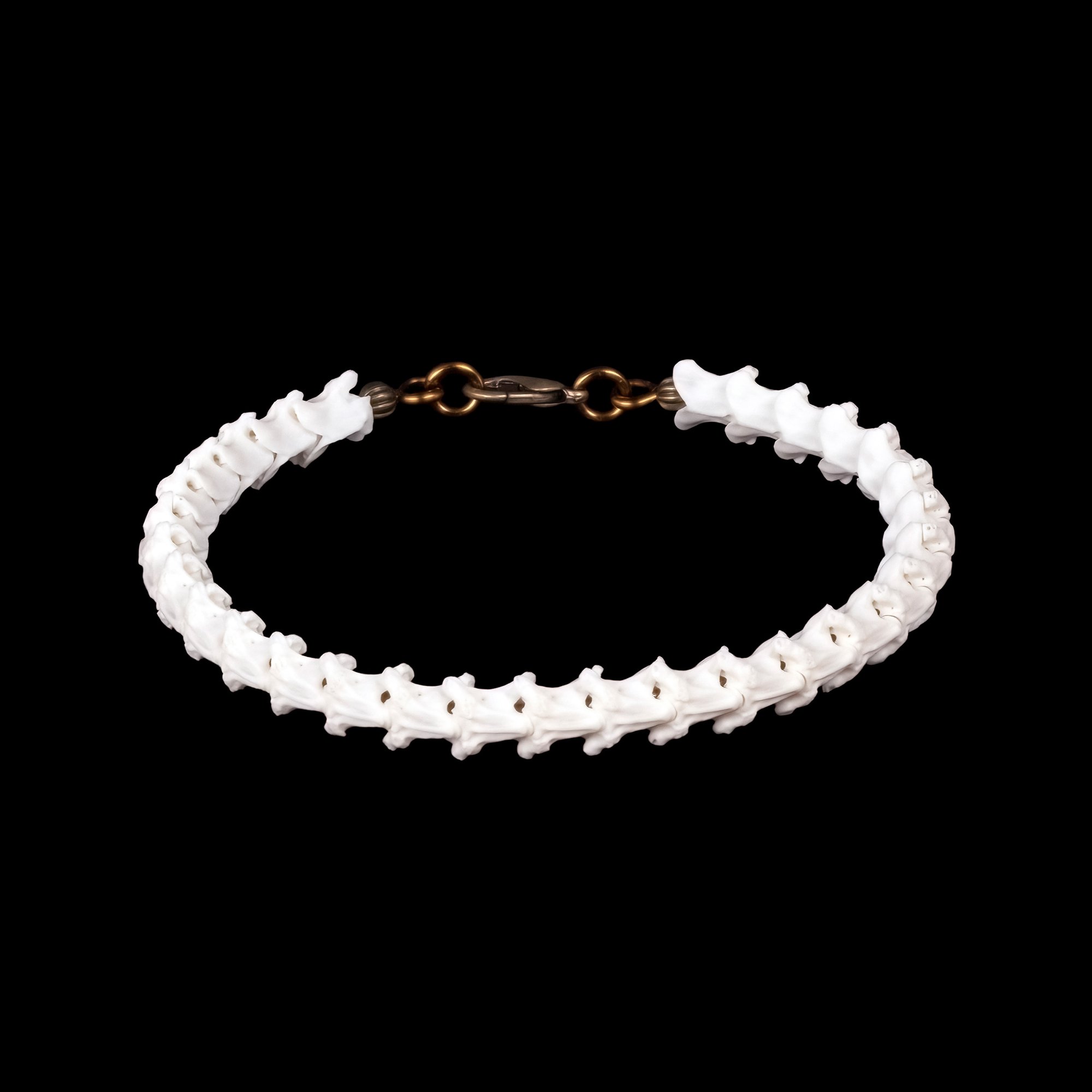 This bracelet is composed of snake vertebrae. It is a nice, understated design that pairs well with all of my snake vertebrae necklaces. The sharper points on the vertebrae have been sanded down so that it is more comfortable to wear. It is embellished with vintage brass beads and features a brass lobster claw clasp. The internal circumference is approximately 7".